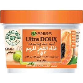 غذاء الشعر المرمم 3 في 1 بابايا وأملا من الترا دوكس 390 ملتغذية غنية بالمستخلصات الغذائية الممتازة لشعر مذهليستخدم ماسك لعلاج الشعر التالفيستخدم حمام زيت ساخن وقناع وبلسم يترك على الشعرتركيبة غنية بالبابايا والأملا المرممة..